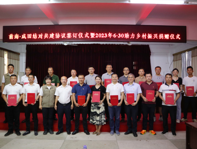 實(shí)地調(diào)研結(jié)束后,相關(guān)單位在鎮(zhèn)政府舉行了“前?!こ商锝Y(jié)對(duì)共建”協(xié)議簽訂儀式暨“2023年‘6·30’助力鄉(xiāng)村振興”捐贈(zèng)儀式。儀式現(xiàn)場(chǎng),前海管理局向成田鎮(zhèn)政府捐贈(zèng)了2023年“6·30”助力鄉(xiāng)村振興籌集資金共147251元;華潤(rùn)深圳醫(yī)藥黨支部發(fā)動(dòng)內(nèi)部基層黨員捐贈(zèng)了一批書(shū)籍和藥品。