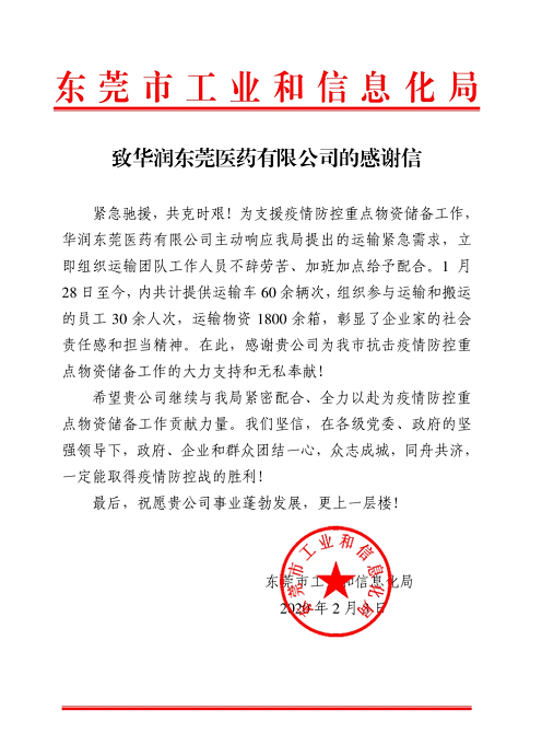 這封感謝信來自東莞市工業(yè)和信息化局,傳遞了東莞市工業(yè)和信息化局對華潤東莞醫(yī)藥提供高效、積極及專業(yè)的物流配送的感謝,也鼓舞了華潤東莞醫(yī)藥此刻為疫情應急物資運輸工作努力奮戰(zhàn)的團隊信心。